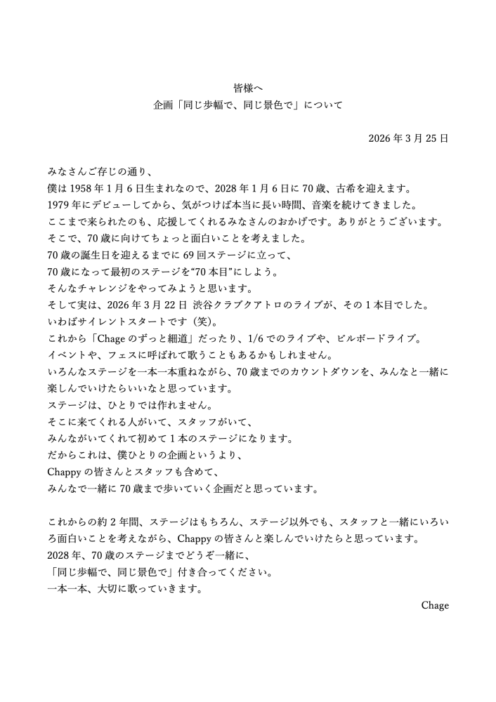 この度、新たな企画が立ち上がりました。Chageからのメッセージが届いています。